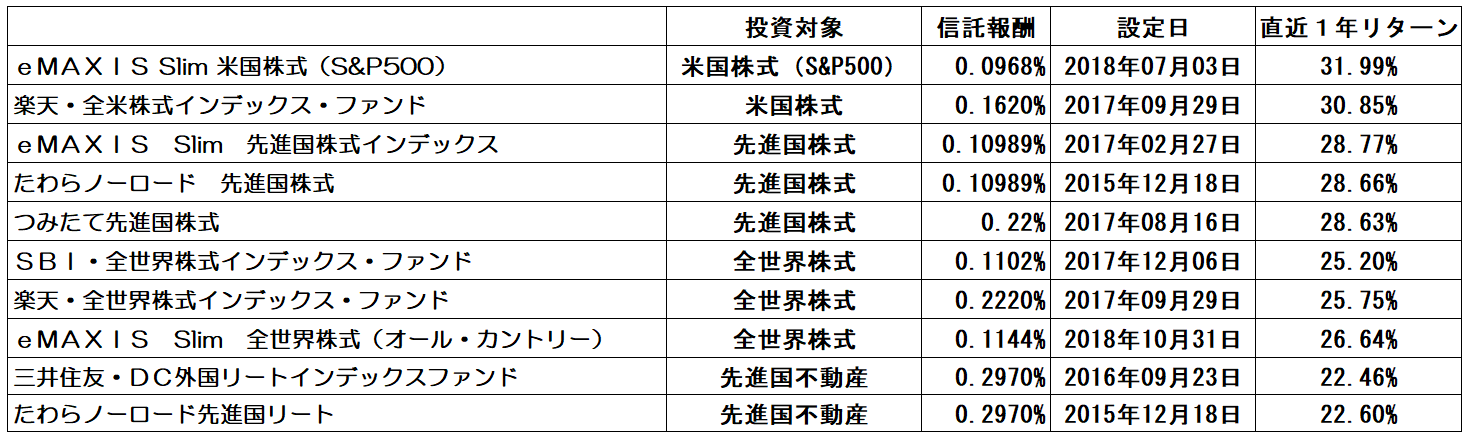 また判断基準として、手数料(信託報酬)を重視しています。ちなみに信託報酬とは、保有しているときに発生するいわば管理費のことで、年率で表します。信託報酬が0. 5%を超えるような金融商品は信託報酬が高すぎるので基本的に投資対象からは除外しています。また、これらの商品は購入時の手数料はかかりません。