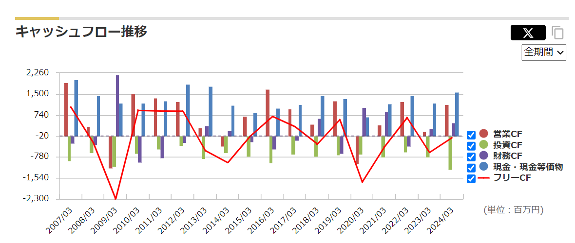 フリーキャッシュフローは赤字と黒字を繰り返し、安定していません。が、シケモク銘柄ではよくある事なので特に気にしていません。安定していないからこそ安く放置されていると思うので。