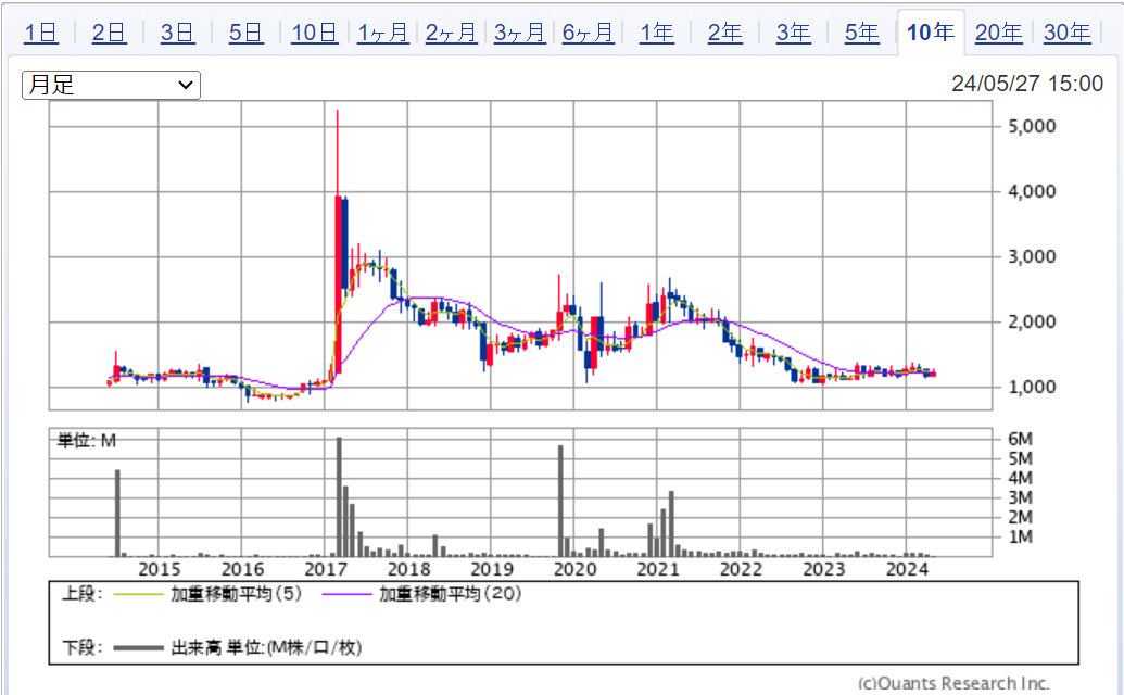2017年に一気に株価が5倍以上になるなど、シケモク銘柄の中では比較的ボラティリティが高いと思います。