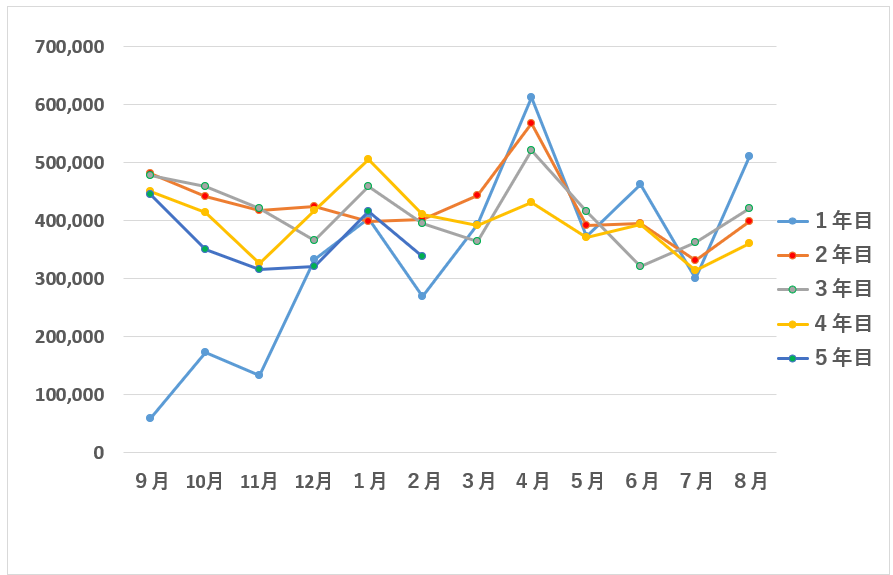 続いて過去の売上と比較したグラフをご覧ください。