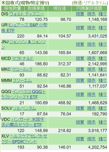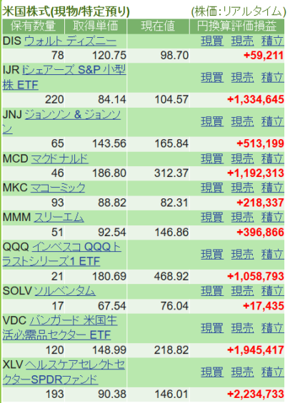 ディフェンシブ銘柄は比較的堅調だったものの、DISやIJR、QQQといった景気敏感銘柄が大きく下げて前月比で78万円のマイナスと、大きめのマイナス幅となりました。