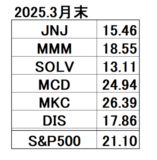 最後に私が保有している個別銘柄とS&P500の2025年3月末現在(S&P500は3月30日)の予想PERです。個別株の予想PERはアメリカのYahoo!Financeを、S&P500についてはWSJを参照しています。
