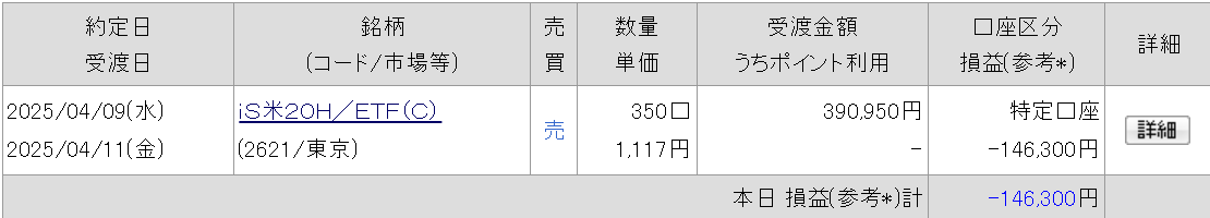 米国債ETFのうち、保有していた「iシェアーズ米国債20年超ETF(為替ヘッジあり) 」を4月9日に39万円分売却しました。
