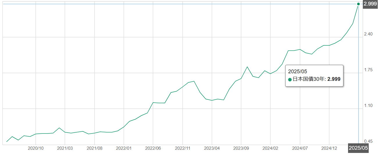 実際日本の金利は上がり続けています。2020年5月にわずか0.495%しかなかった日本の30年債利回りは、5月22日時点で2.999%と3%台が目前となっています。