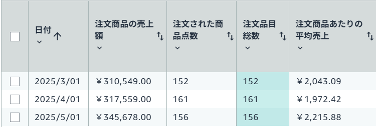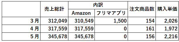 まず初めにAmazonでの上記期間の売上の表を載せ、その次に私がエクセルで作成したAmazonとフリマアプリの売上の集計を載せたいと思います(フリマアプリには売上の集計機能がないため自分で表を作成)。