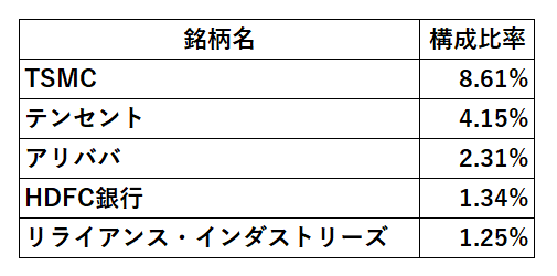 続いてSPEMの構成銘柄のうちの上位5社と構成比率は以下の通りです。
