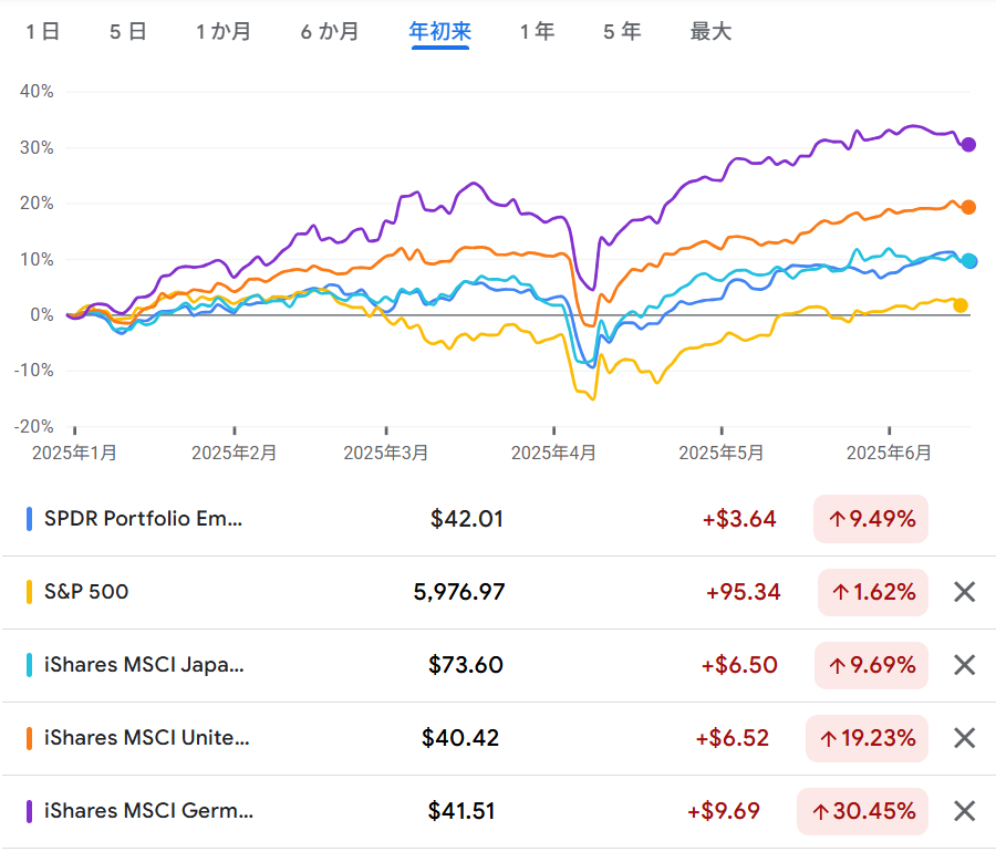 S&P500は年初来で1.62%のプラスとわずかながらのプラスであるのに対し、新興国株は10%弱の上昇、ドイツに至っては30%もの上昇を見せています。