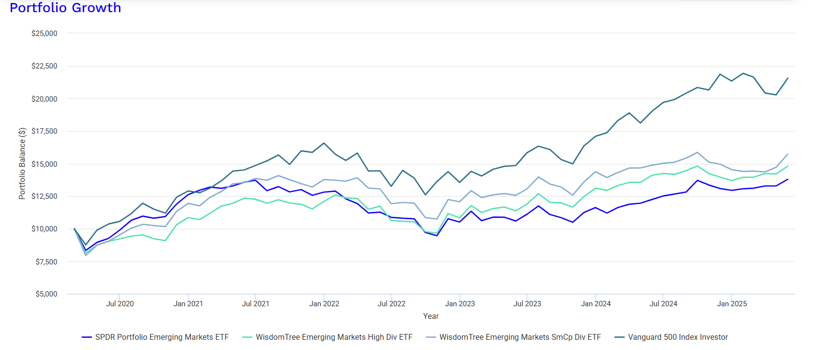 リターンの比較は配当再投資を含めた形で比較できるPortfolio Visualizerを利用しています。比較期間は私がSPEMの購入を開始した2020年3月から2025年5月までです。それではご覧ください!
