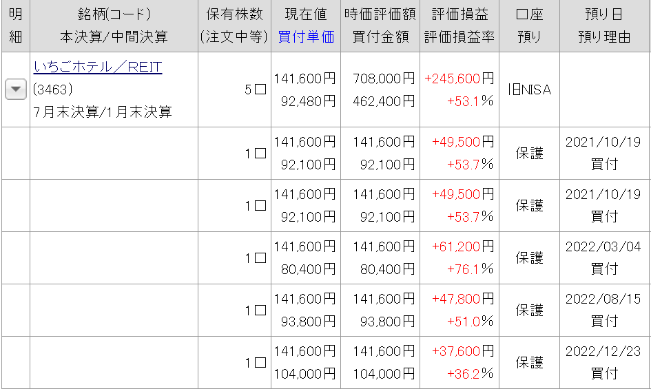 また分配金だけではなく投資口価格も大きく値上がりしており、2021年から2022年にかけて購入した分については50%以上値上がりしています(今年の4月にも追加購入していますが、4か月ちょっとの期間で20%以上上昇しています)。