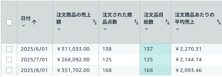 まず初めにAmazonでの上記期間の売上の表を載せ、その次に私がエクセルで作成したAmazonとフリマアプリの売上の集計を載せたいと思います(フリマアプリには売上の集計機能がないため自分で表を作成)。