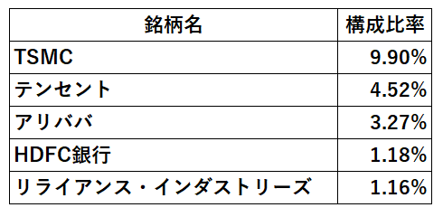 順位に入れ替わりがありました。構成銘柄第5位が中国企業のシャオミだったのが、インドのリライアンス・インダストリーズに変わりました。この2銘柄は頻繫に入れ替わりますね。