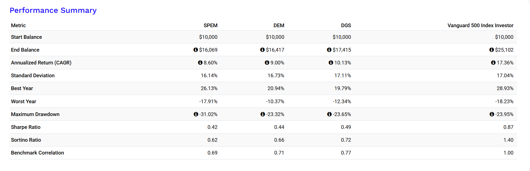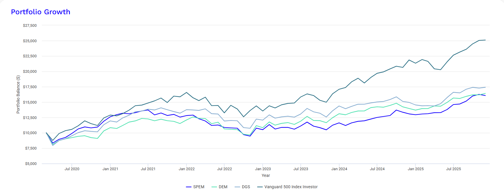リターンの比較は配当再投資を含めた形で比較できるPortfolio Visualizerを利用しています。比較期間は私がSPEMの購入を開始した2020年3月から2025年11月までです。それではご覧ください!