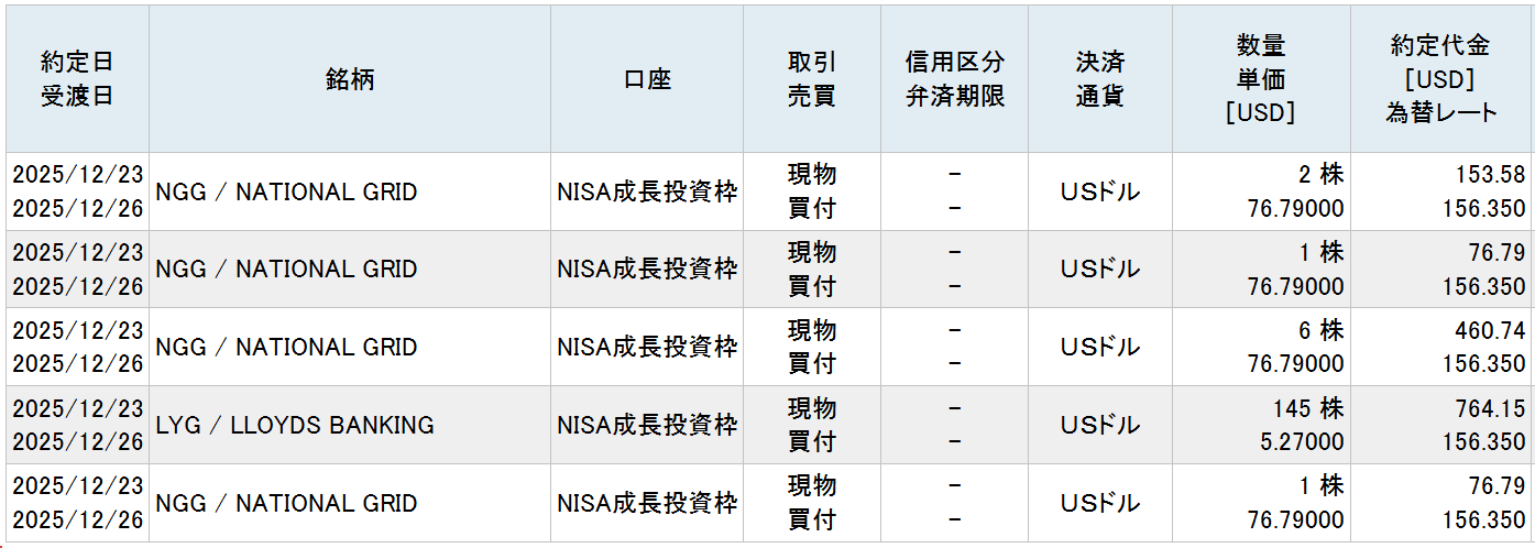 12月23日に購入し、金額は日本円でNGGとLYGはそれぞれおよそ12万円、合計約24万円ほど購入しました。
