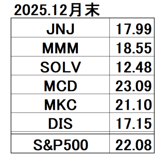 2025年もディフェンシブ銘柄を中心とする私の米国株ポートフォリオは市場平均と比べて冴えない結果になってしまいましたが、上記の予想PERを見てもらえるとわかる通り過熱感はありません。