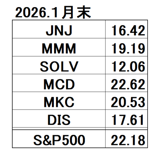 最後に私が保有している個別銘柄とS&P500の2026年1月末現在の予想PERです。個別株の予想PERはアメリカのYahoo!Financeを、S&P500についてはWSJを参照しています