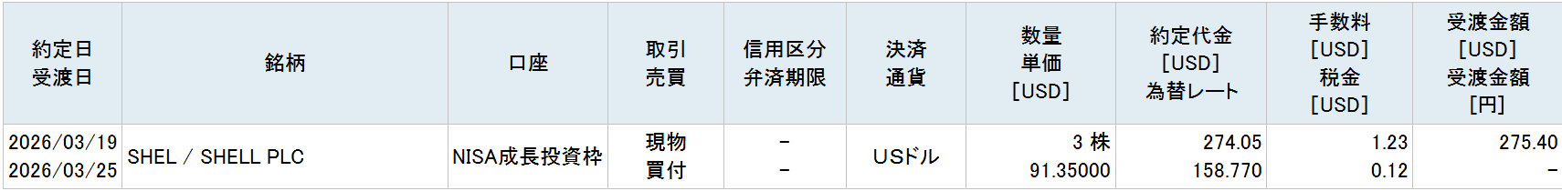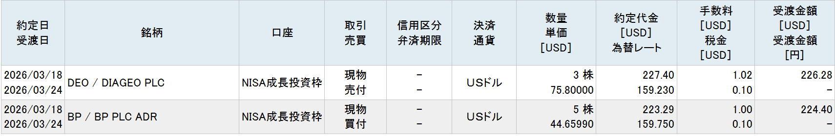3月18日に保有していたディアジオを売却し、その売却資金で石油株のBPを購入しました。また翌日の3月19日にシェルを追加購入しました。