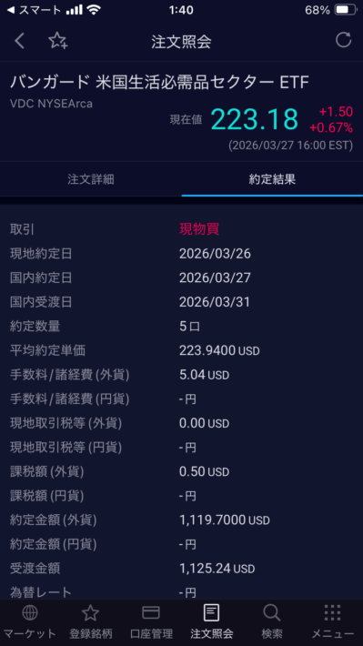 そしてこの度、3月26日に9度目の配当再投資を行いました。購入した銘柄は生活必需品セクターETFであるVDCです。